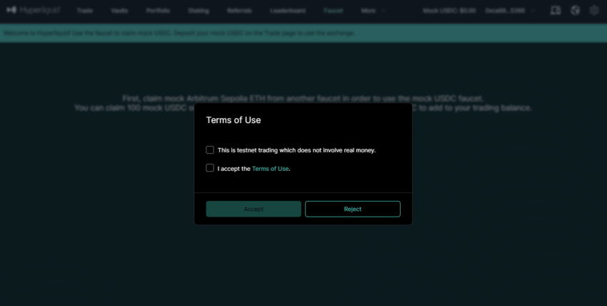 2. ウォレットでログインする:ウォレットでログインし、ハイパーリキッドテストネットサイトにアクセスします。利用規約に同意した場合、ログインを続行してください。