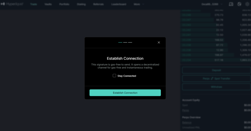 - ETHとUSDCを取得した後、ハイパーリキッドに接続します。ウォレットを接続し、ウォレット内で必要な取引に署名します。