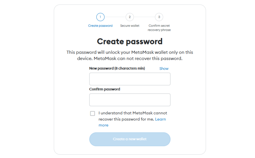 - MetaMaskウォレットを保護するために、強力なパスワードを作成します。パスワードは少なくとも8文字以上で、記号や特殊文字を含めることでセキュリティを強化できます。
