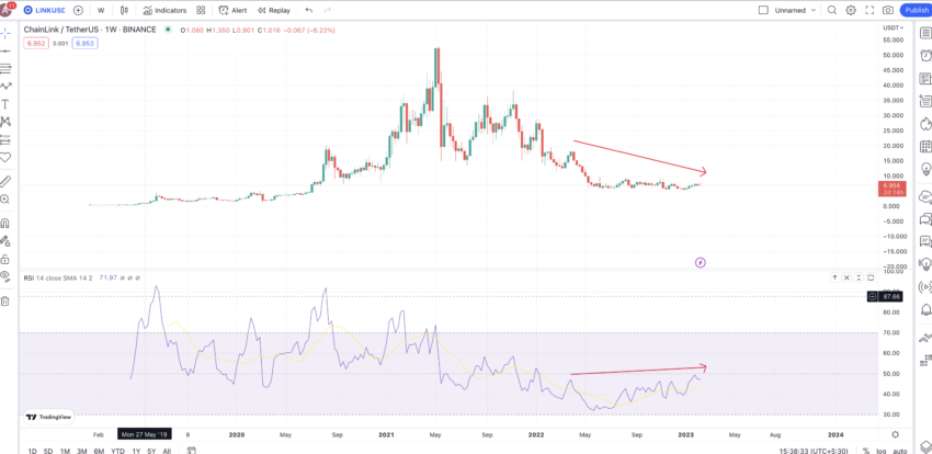 一方で、LINKの対策に新たな上昇パターンが見られる可能性もあります。週次のRSIは価格よりも高く、強気のダイバージェンスを形成しつつあります。これにより、LINKトークンの価格が中期的に上昇し、チャートの左側または高値パターンに向かう可能性が高まります。