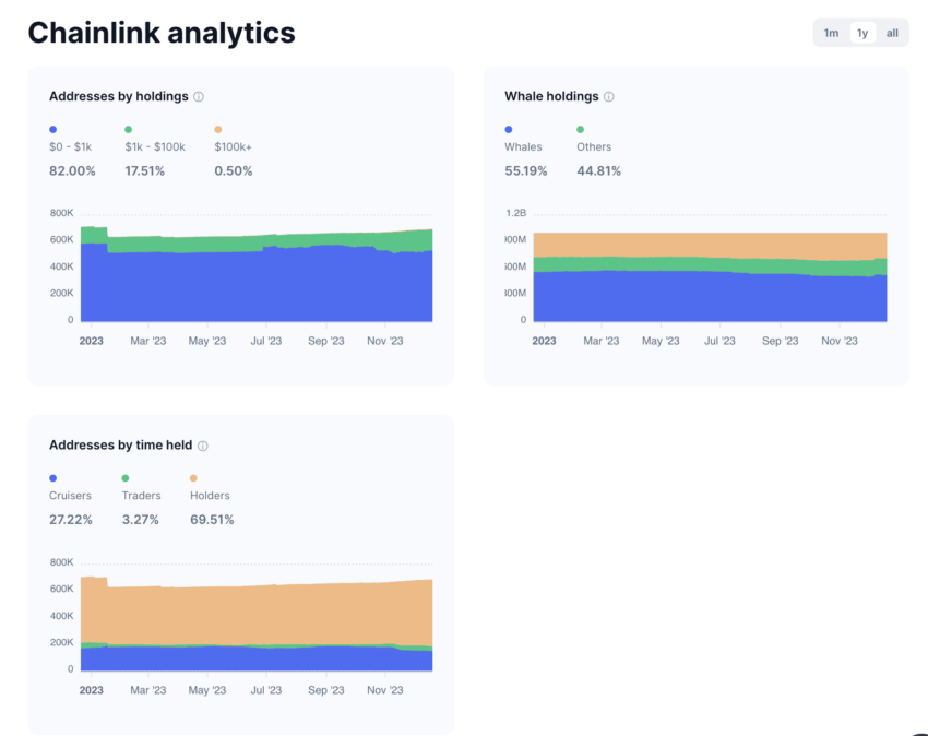 2024年にはLINKのステーキングが市場に定着し、売却圧力の低下が確認されました。長期保有者(Holders)の割合は80.18%に達し、短期トレーダー(Traders)は3.33%と低水準を維持しています。これは、多くの投資家が短期の利益を狙うのではなく、LINKを長期間保有する選択をしていることを示しています。