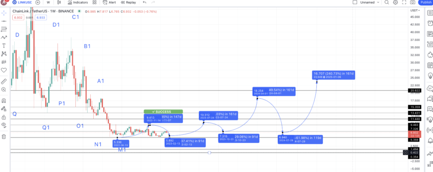 2024年半ばには、強気のセンチメントがさらに強まる可能性があります。したがって、$6.94の安値から240.23%の上昇(表1の成長率の一つ)が期待され、2025年にはLINKの平均取引価格が$23.648に近づくことが予想されます。