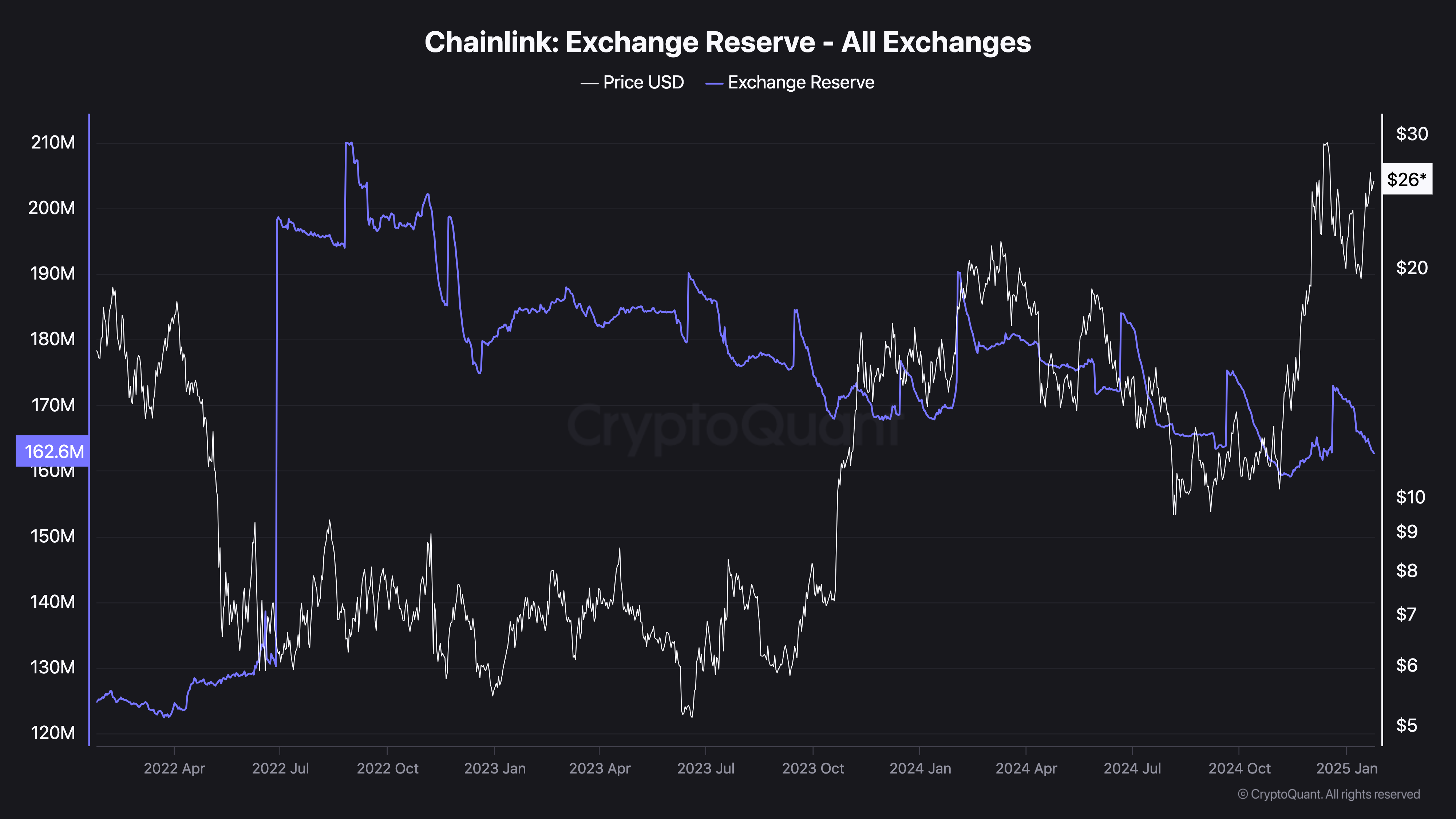 オンチェーンデータによると、LINKトークンは新たなラリーに向けた動きを示している可能性があります。黒のラインは価格を、青のラインは取引所のLINK準備金を示しており、最近の価格上昇とともに取引所準備金が減少傾向にあることが確認できます。これは、投資家がLINKを取引所から引き出し、長期保有の姿勢を強めていることを示唆しています。