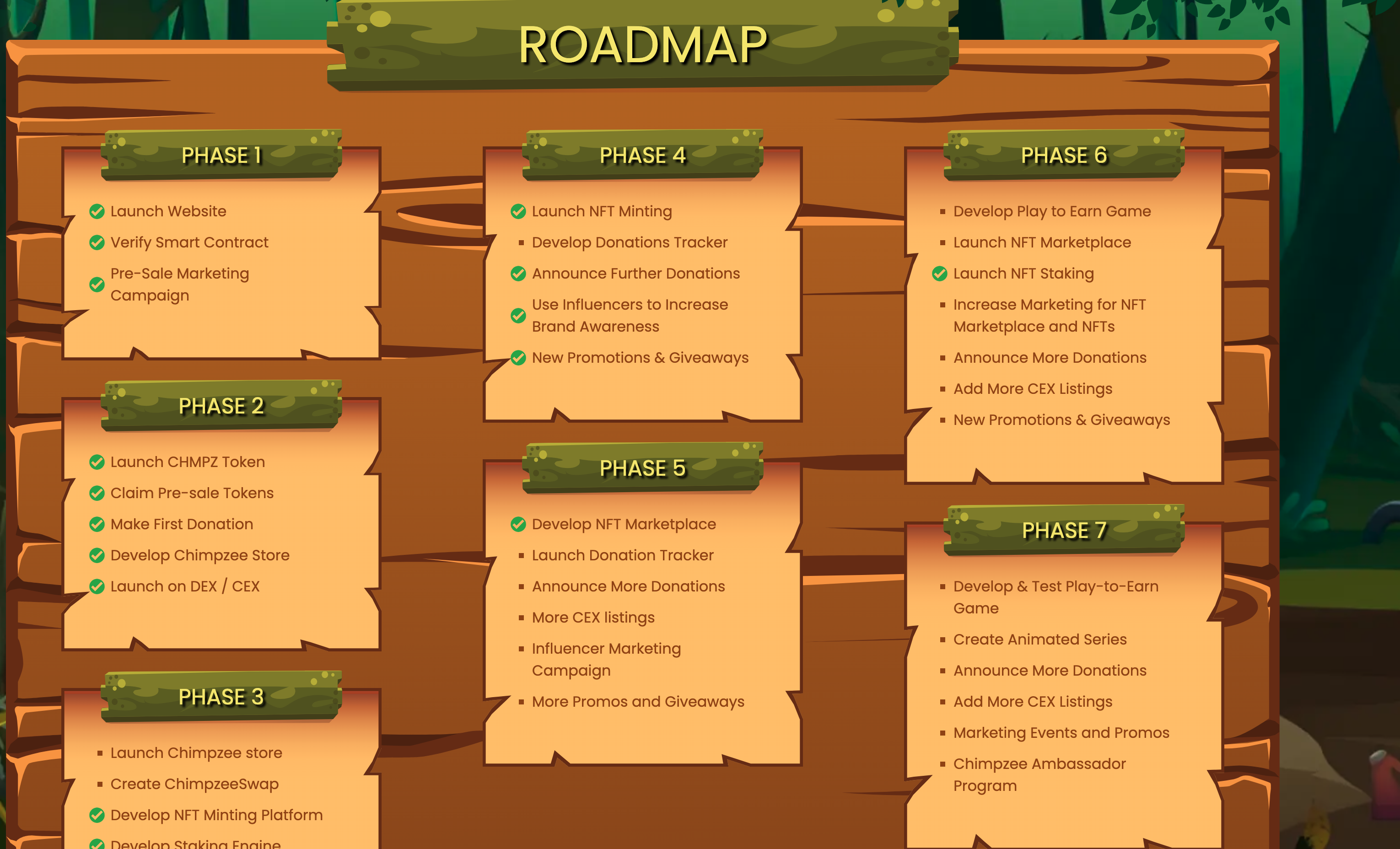 ミームコインと対照的なアルトコインであるChimpzeeは、動物の絶滅を防ぎ、環境の進歩を確実にしたいというチームの願いから生まれました。このプロジェクトはすでに、熱帯雨林を回復させるために1,200本の植林を支援しています。さらに同プロジェクトは、砂漠に適応したゾウの最後の群れのひとつを保護するため、WILD財団に1万5000ドルを寄付しました。