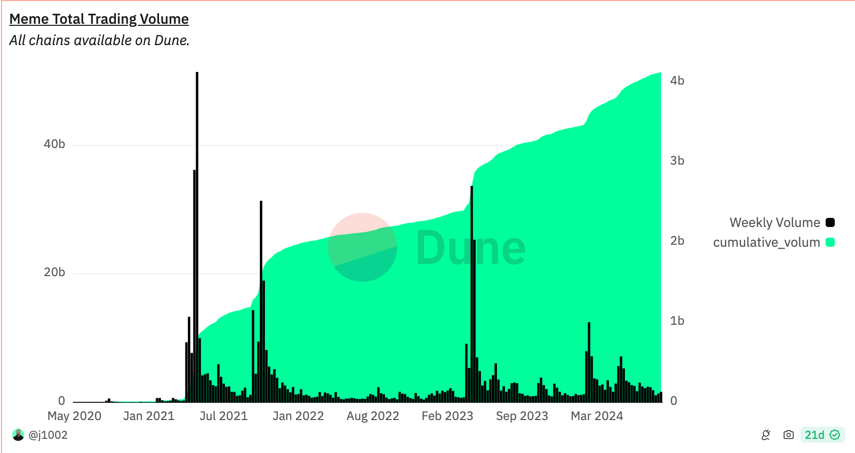 ミームコインといえば、ドージコインや柴犬コインを思い浮かべる人が多いでしょう。しかし、これらのトップミームコインで市場が異常な上昇を目撃して以来、さらに多くの類似した暗号資産が登場しています。以下は、現在流通しているミームコインの総取引量を示したチャートです。