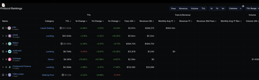 ユニスワップは、TVLでランク付けされたDeFiプロトコルの中で第5位に位置し、過去30日間で9.67%の純増を記録しています。