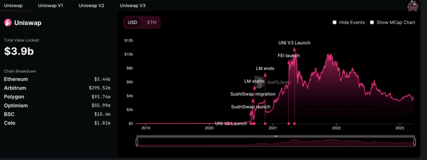 ユニスワップはイーサリアムブロックチェーン上でスタートしたものの、2023年3月24日時点では、イーサリアム、アービトラム、ポリゴン、バイナンススマートチェーン、セロ、オプティミズムの6つのチェーンにまたがって、**39億ドル相当のTVL(Total Value Locked:総預かり資産)**を記録しています。