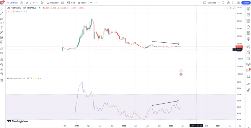 未マークの週足チャートを確認すると、明確なパターンが浮かび上がってきます。UNIは高値を更新しながらも、その後はやや低めの高値を記録し、レンジ相場に入っていることがわかります。しかし、RSIのダイバージェンス(乖離)が示されていることから、パターンが再び上方向にブレイクする可能性もあります。