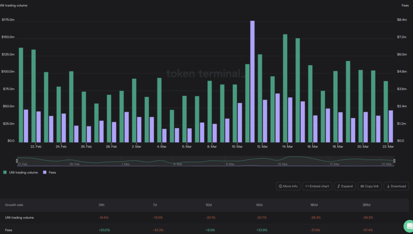 ユニスワップの直近30日間の取引量は32%減少しており、これはプロジェクトにとってポジティブな兆候とは言えません。ただし、取引量の下落にもかかわらず、2023年3月の取引量(緑の棒グラフ)は2月よりも高水準で推移していました。