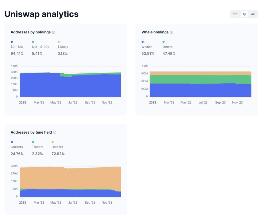 Uniswap analytics: CoinMarketCap さらに、ユニスワップの分析によると、UNIトークン保有者の約73%がガチホ勢(長期保有者)であり、価格に対して楽観的な姿勢を見せているようです。
