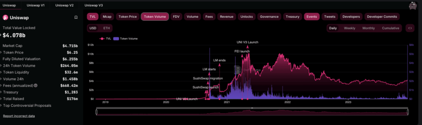 そして2023年12月時点には、12チェーンに展開されており、TVLもわずかながら増加しています。これは、ネイティブトークンであるUNIにとってポジティブなサインと見ることができます。