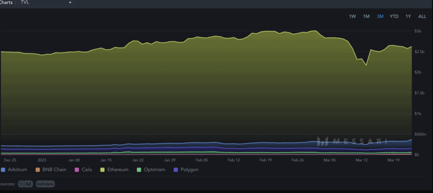 なお、TVLの大部分はイーサリアムブロックチェーン上に集中しています。アービトラム上でのTVLも徐々に増加しているものの、イーサリアムほどの規模にはまだ達していません。