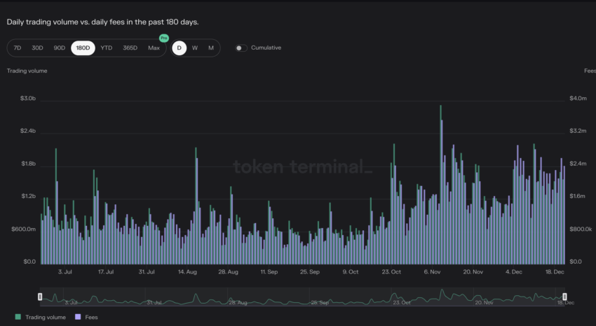 Uniswap price prediction and trading volume: Token Terminal 2023年末に向かって、ユニスワップの取引量および手数料が再び増加傾向にあり、採用率の上昇を示唆しています。