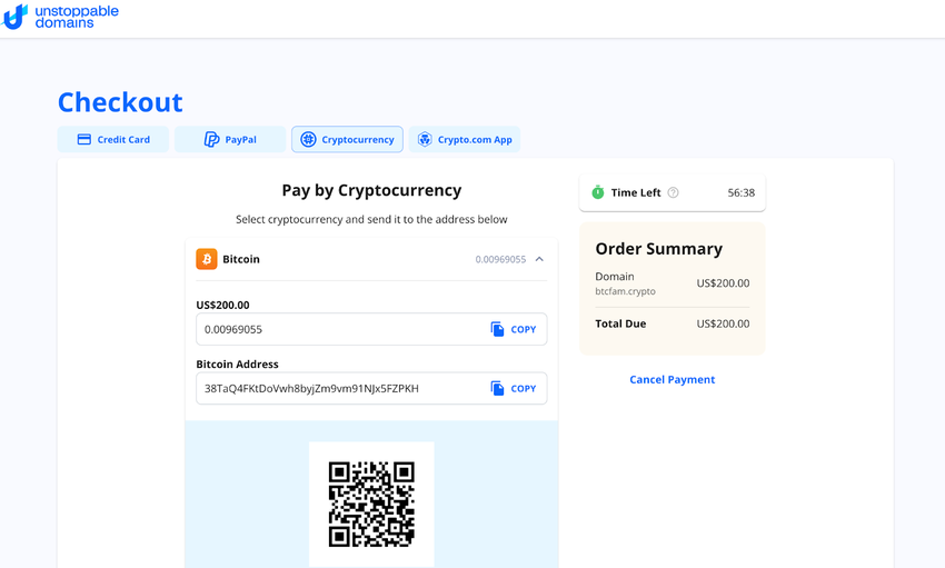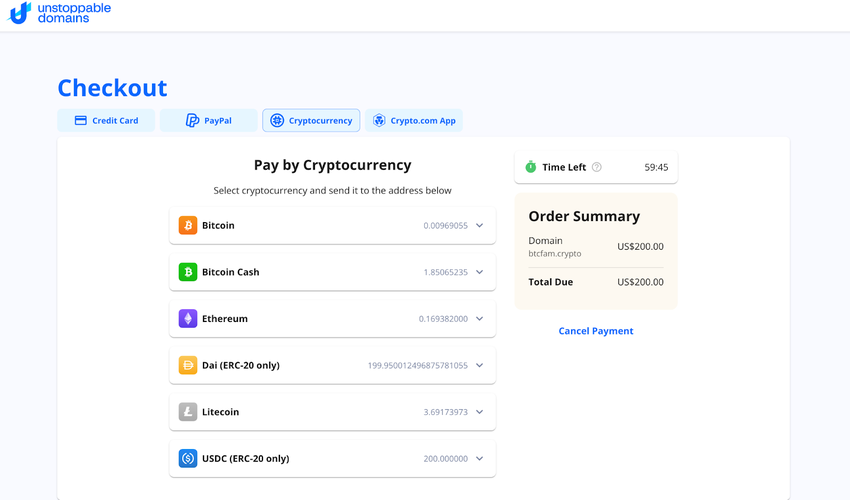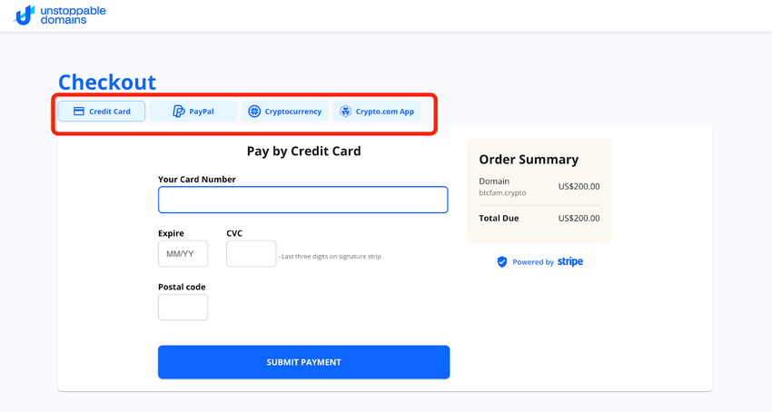 最後のステップは、支払い方法を選択することです。Unstoppable Domainsでは、クレジットカード、PayPal、暗号通貨、Crypto.comアプリでの支払いが可能です。
