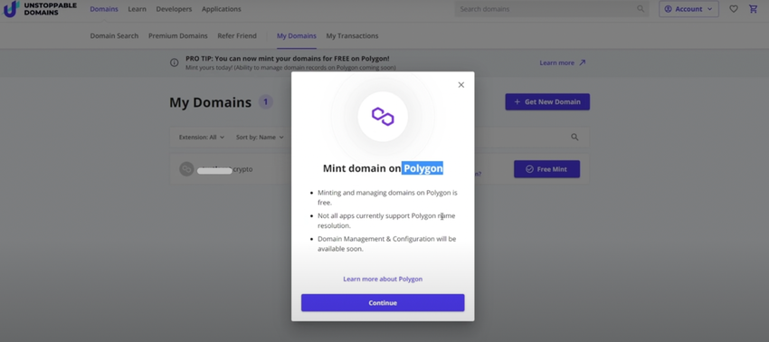 ドメインを購入したら、そのことをブロックチェーンに知らせる必要があります。”My Domains“にアクセスし、”Free mint“をクリックします。「.crypto」ドメインを持っていれば、イーサリアムのレイヤー2ソリューションであるPolygonネットワーク上で無料でミントすることができます。