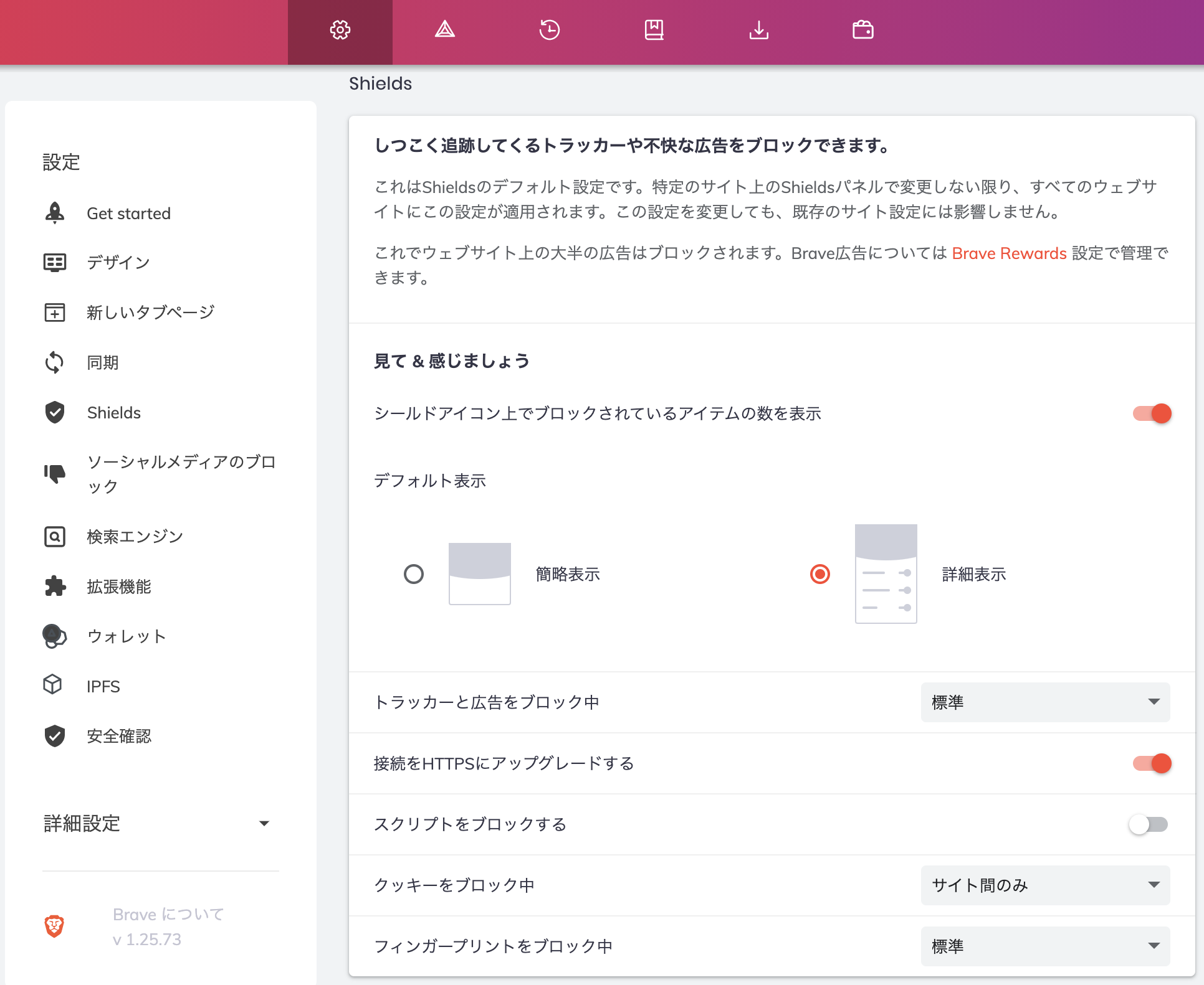 プライバシー設定:設定から「Shields」を開き、広告ブロックやトラッカー防止のレベルを調整します。