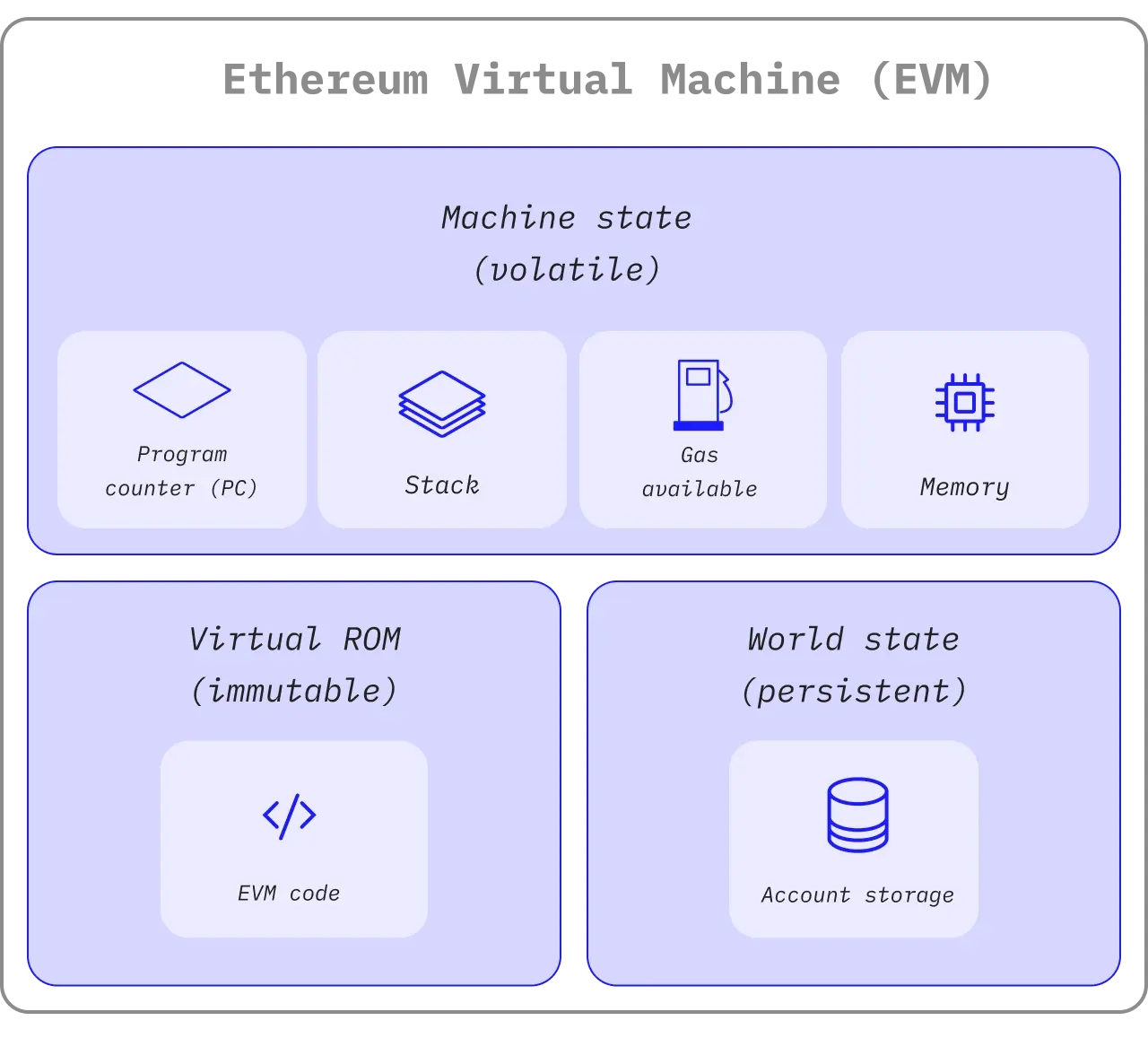 EVMは、データを「スタック」と呼ばれる特定の構造で管理するコンピュータの一種であるスタックマシンとして動作します。EVMは1024項目のスタックを使用して計算を行います。スタックの各項目は256ビットの単語(データの単位)で、これは暗号技術に適したサイズです。