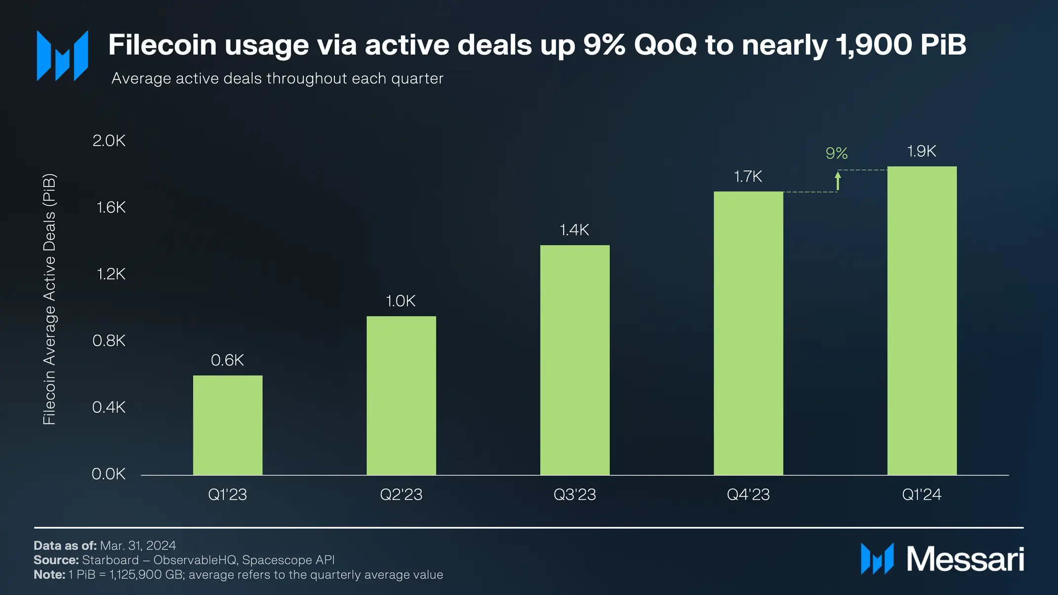 2024年第1四半期には、ファイルコインのストレージ市場が成長しました。アクティブな取引は前四半期比で9%増加し、利用率は23%に上昇しました。ストレージ容量は14%減少しましたが、2000以上のクライアントがデータをオンボードしており、そのうち508は1000TiB以上の大規模データセットをオンボードしています。
