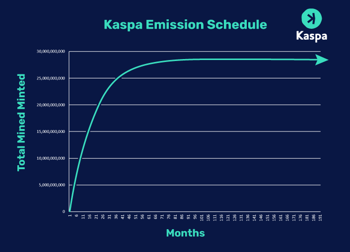 Kaspaのトークンエコノミクスは、その持続可能性と価値を支える重要な要素です。KASの最大供給量は28.7億であり、インフレを抑制し価値を維持するための設計がされています。Kaspaは、ビットコインと同様に半減期スケジュールを採用していますが、その頻度は年に一度です。最初の供給率は高く設定されており、毎月徐々に減少していきます。このスケジュールは、1年間で供給率が半減するように設計されています。