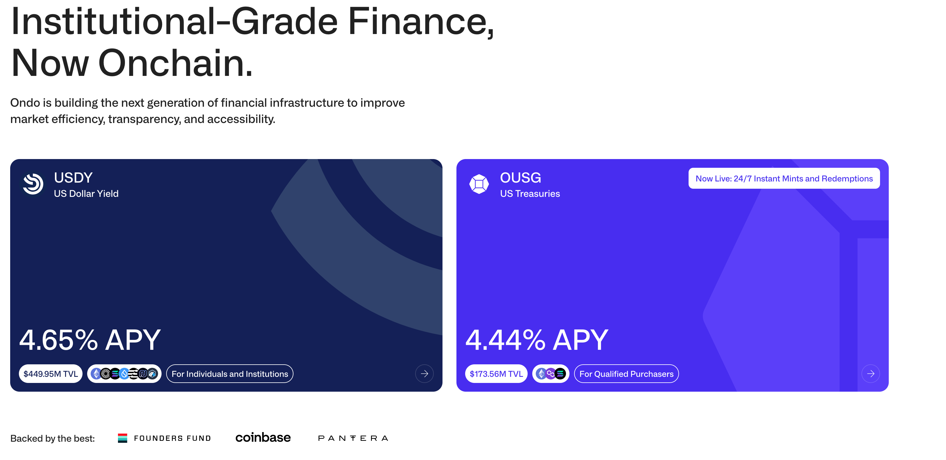 USDYは、米国短期債と銀行預金によって裏付けされた利回り付きステーブルコインです。年利約5%の変動利回りを提供し、従来のステーブルコイン(例:USDT)と異なり、利回りをホルダーに直接還元する構造となっています。USDYは高い透明性と堅牢な規制遵守を維持しつつ、非米国居住者を対象に提供されており、特に安定した収益を求めるリスク回避型の投資家に適しています。 - OUSG(Ondo US Government Treasuries)