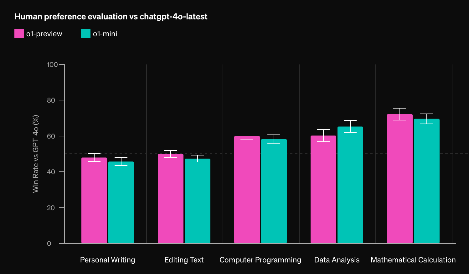 一方でo1は、GPT-4oと比較して、推論が重要な分野で優れている一方、言語処理を重視する分野ではGPT-4oが好まれるという結果が出ています。特に、数学や科学技術などのSTEMタスクに強みを発揮する一方で、幅広い言語タスクではGPT-4oが依然として優勢です。この結果は、o1シリーズの用途を決定する際に重要で、複雑な推論が必要な場面での利用が最適です。