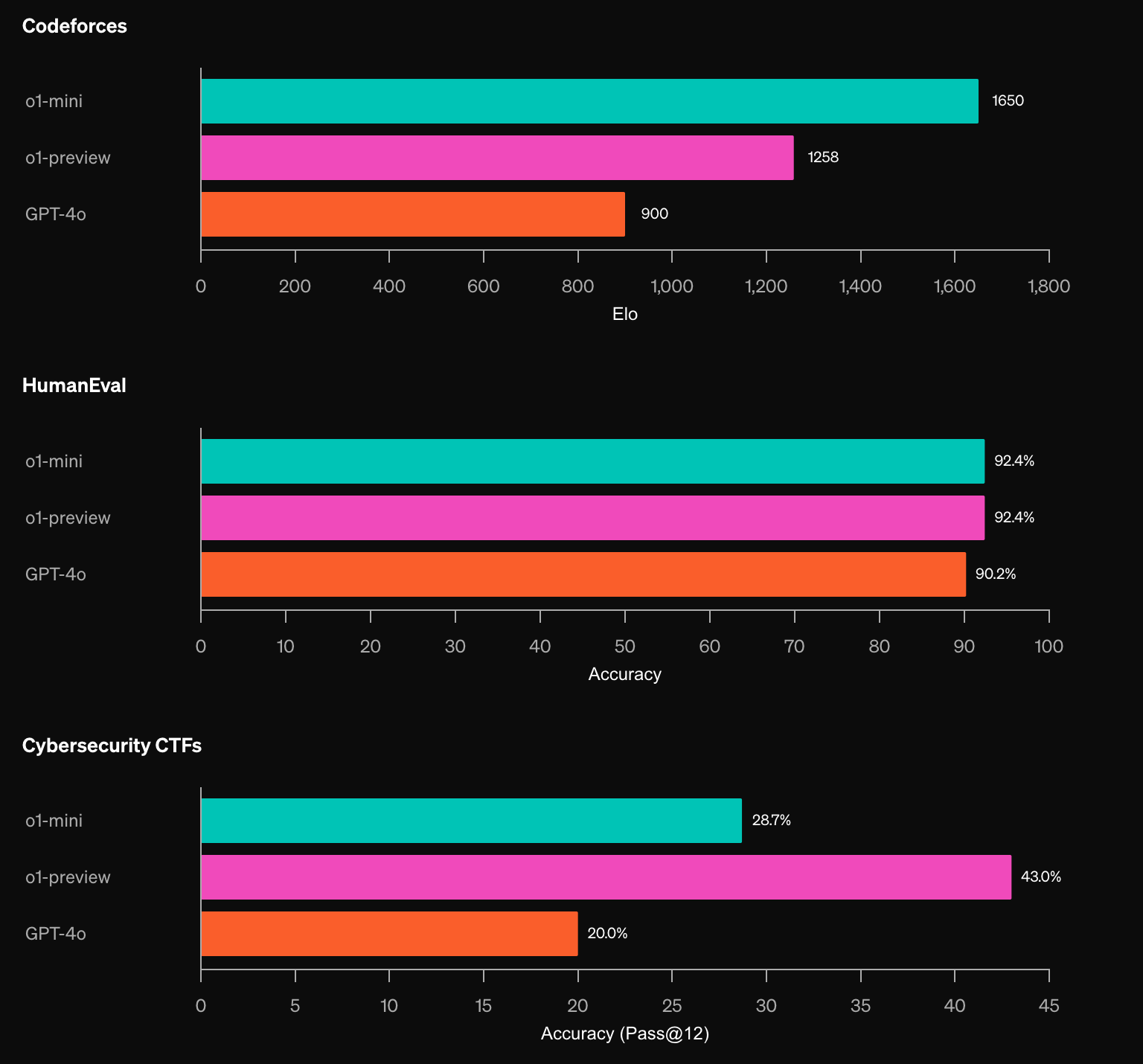 一方、サイバーセキュリティCTF(Capture the Flag)の課題では、o1-previewが43.0%の正答率で、o1-miniの28.7%を上回る結果となりました。o1-miniはSTEM領域に特化しており、コストはo1-previewよりも80%安価で、より高速な応答が可能です。しかし、世界知識が必要なタスクにおいては、o1-previewに劣る場合があります。以下に両モデルの比較表を提供します: