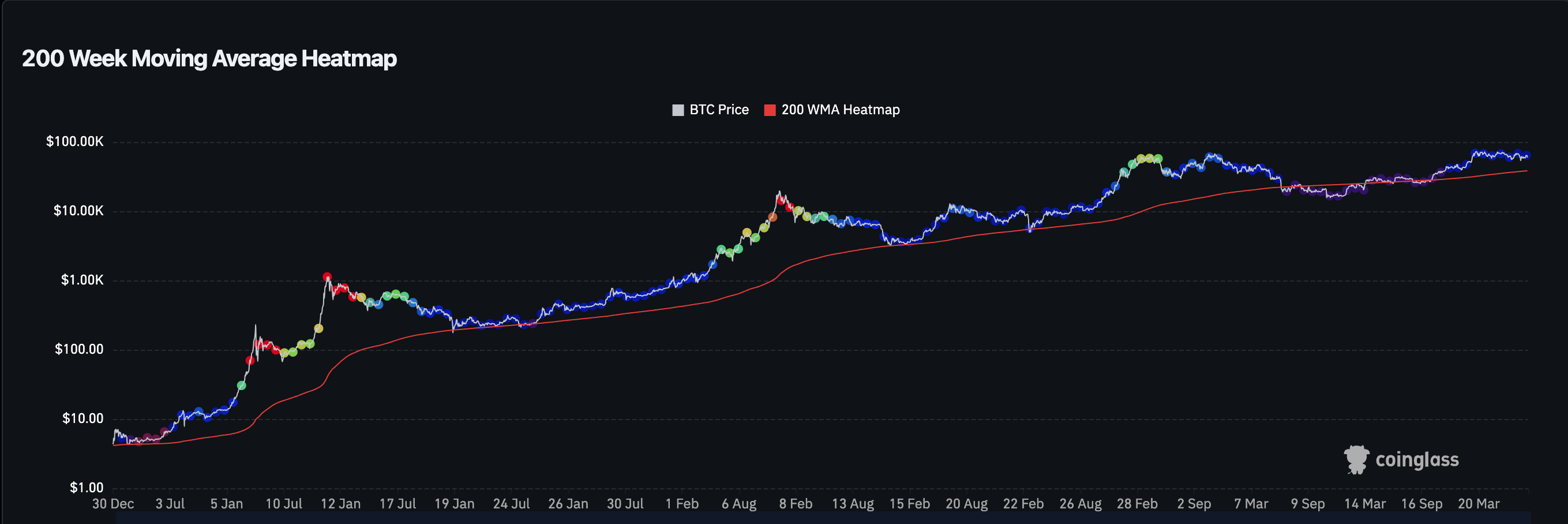 200週移動平均ヒートマップ(200-Week Moving Average Heatmap)は、ビットコインの長期的な市場サイクルを分析するための指標で、過去200週間の平均価格を基に作成されます。ヒートマップは、ビットコインの価格がこの移動平均線からどれだけ乖離しているかを色で示し、価格が過去の平均と比較して過大評価または過小評価されているかを視覚的に捉えます。投資家はこれを使い、極端に低い場合は買い時、極端に高い場合は売り時と判断する際に利用します。