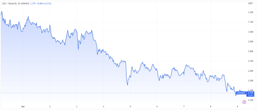 イーサリアム・ステーキングソリューション・サービスで人気のある「リドファイナンス」。このガバナンストークンであるLDOは最近、急落局面にある。同トークンは過去24時間で6%以上、過去1週間で約18%下落した。現在(報道発表時)、2.37ドルの値を付けている。