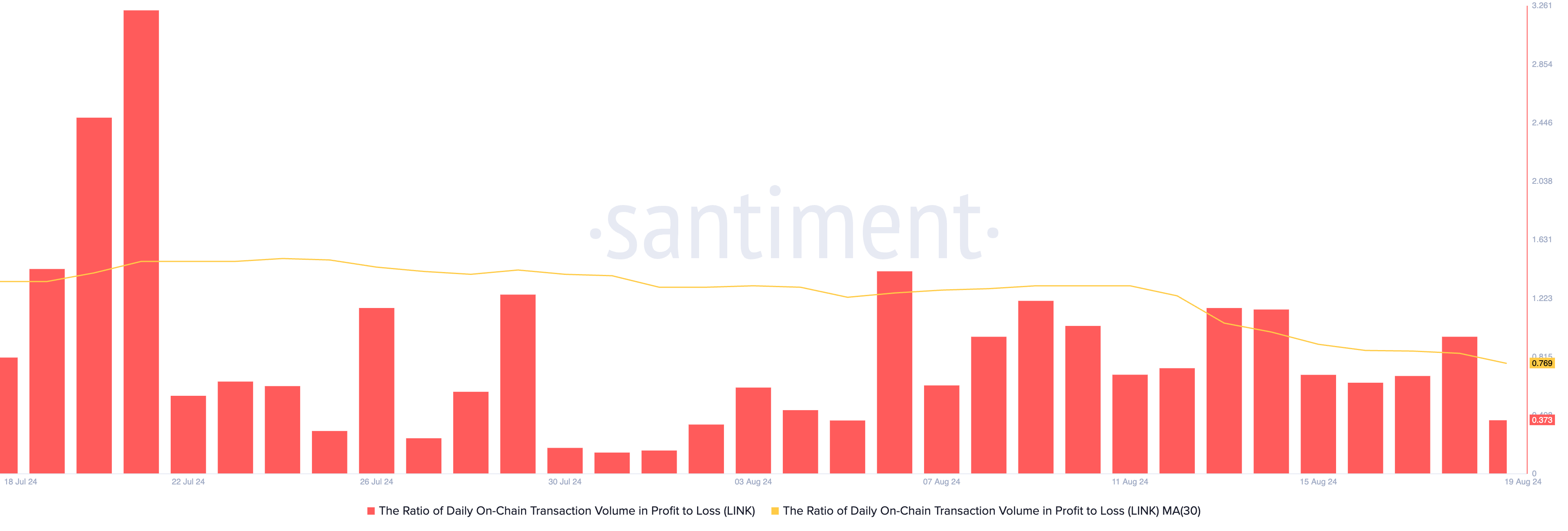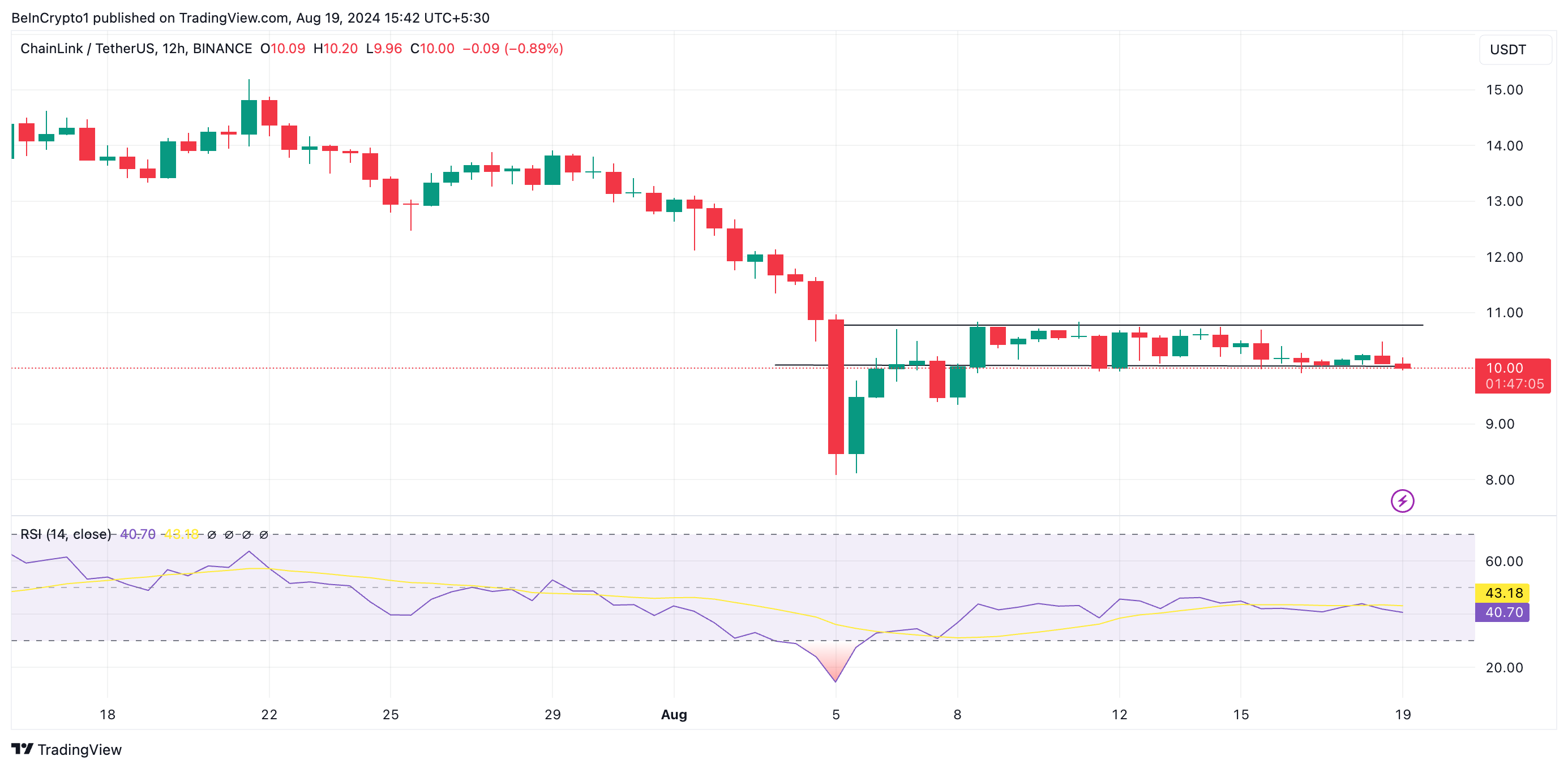これはLINKの相対力指数(RSI)の横ばいから読み取れる。この記事を書いている時点では、LINKのRSIは40.83で、8月6日以来横ばいが続いている。