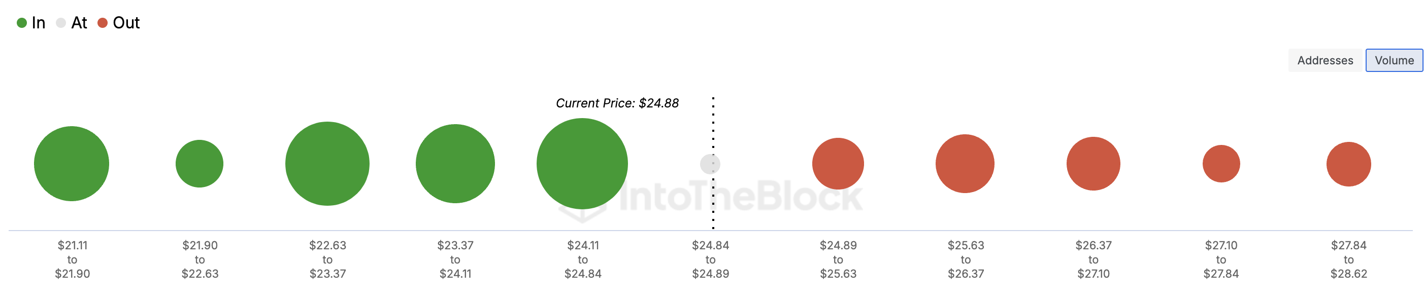 特定の価格範囲での大きなトークンクラスターは、より強いサポートまたは抵抗レベルを示す。IntoTheBlockのデータによれば、22ドルから25ドルの間の「利益が出ている」トークンのボリュームは、26ドルから28ドルの間のボリュームを上回っている。これは、LINKが短期的に30ドルに向かうのを助ける強いサポートゾーンを示している。