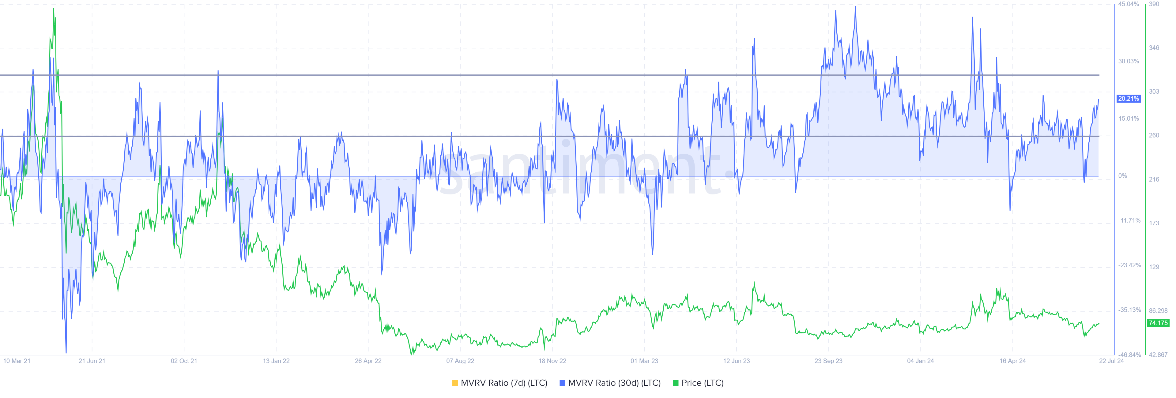 Sponsored現在、ライトコインの30日MVRVは20%で、収益性と潜在的な売り圧力を示している。歴史的に、LTCはMVRVが危険水域として知られる10%から28%の間にある時にしばしば修正される。