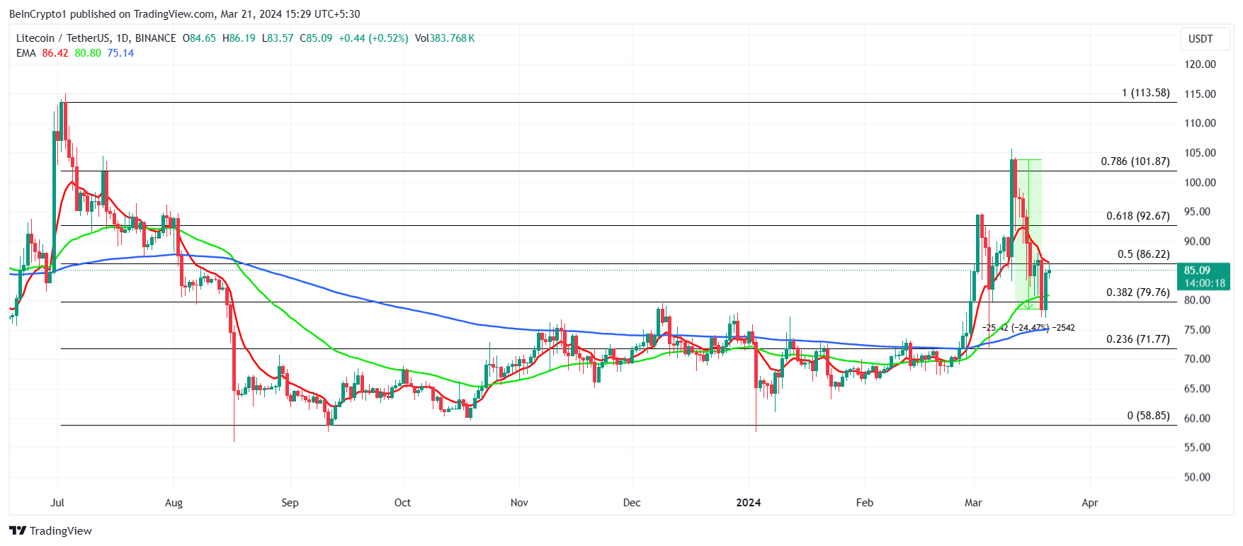 本稿執筆時点で85ドルで取引されているライトコイン価格は、50日指数移動平均(EMA)のすぐ下にあり、86ドルのレジスタンスレベルと一致している。この価格ポイントは、113ドルから58ドルのフィボナッチ50%リトレースメントと合流している。