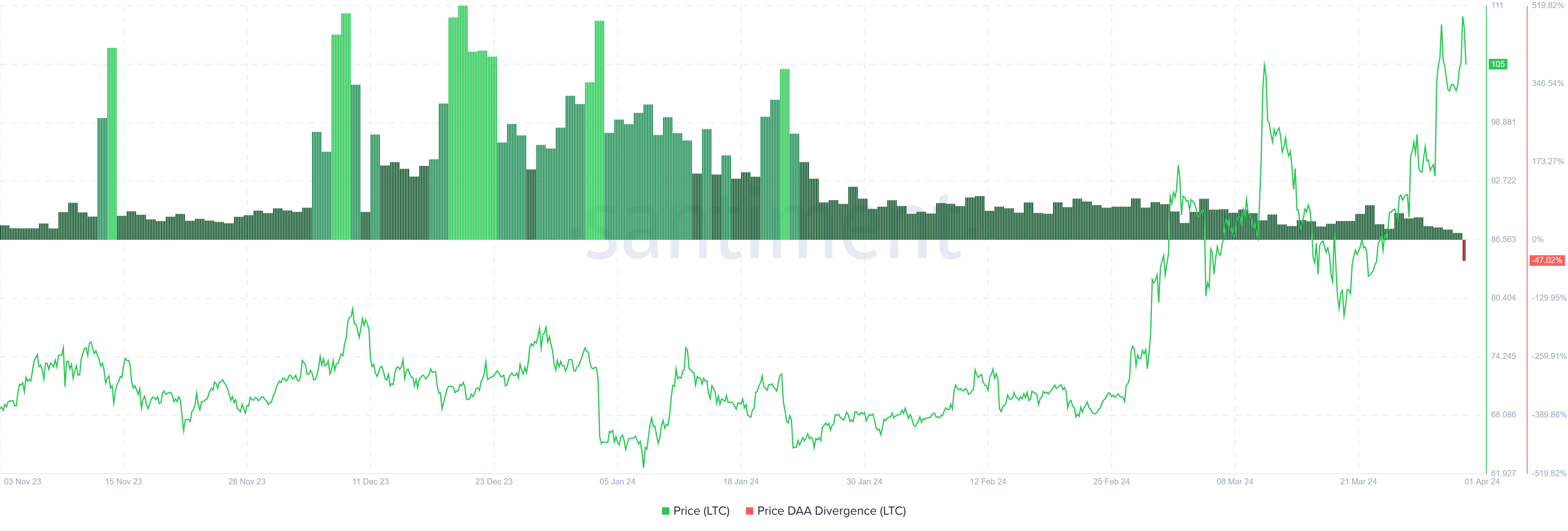 この弱気に拍車をかけるのが、弱気を示唆する価格デイリーアクティブアドレス(DAA)ダイバージェンス指標だ。一般的に、価格が低く、投資家の参加が高い場合、買いシグナルと見なされる。