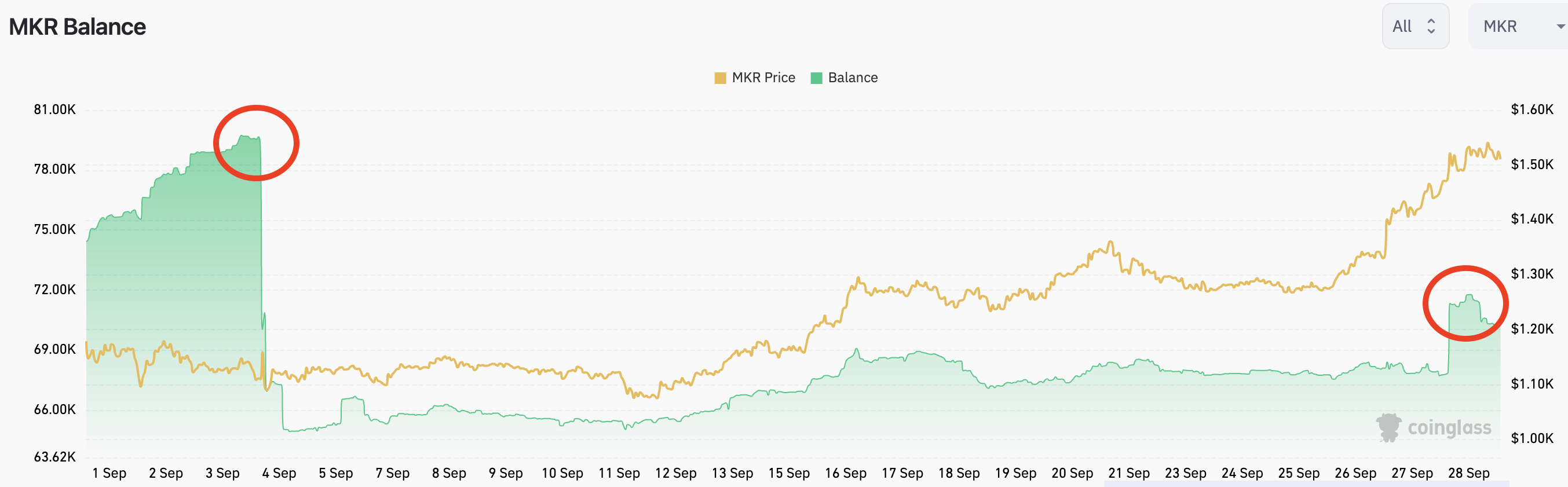 オンチェーン分析ツールCoinglassによると、中央集権型取引所(CEX)が保有する暗号通貨メイカーの残高は、28日に前日比5.75%増の7万1750MKR(1億1100万ドル相当)と上昇したことが観測された。これは、3日以来の高水準となる。暗号資産(仮想通貨)を取引所に大量移動する行為は、その後の利確目的の売却を示唆し、投資家の不安を煽る傾向がある。そのため、暗号通貨MKRの価格動向についても注意する必要がある。