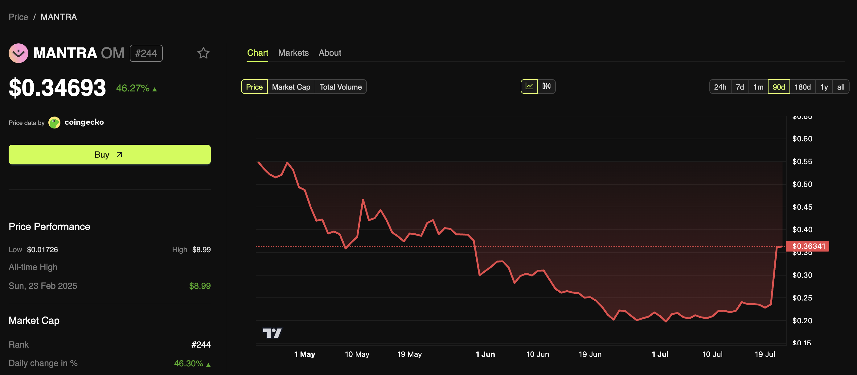 しかし、最近の動向は転換の可能性を示唆している。BeInCryptoのデータによれば、OMは3か月にわたる下落から脱却した。過去1日で、このアルトコインの価格は46.27%上昇し、0.34ドルで取引されている。