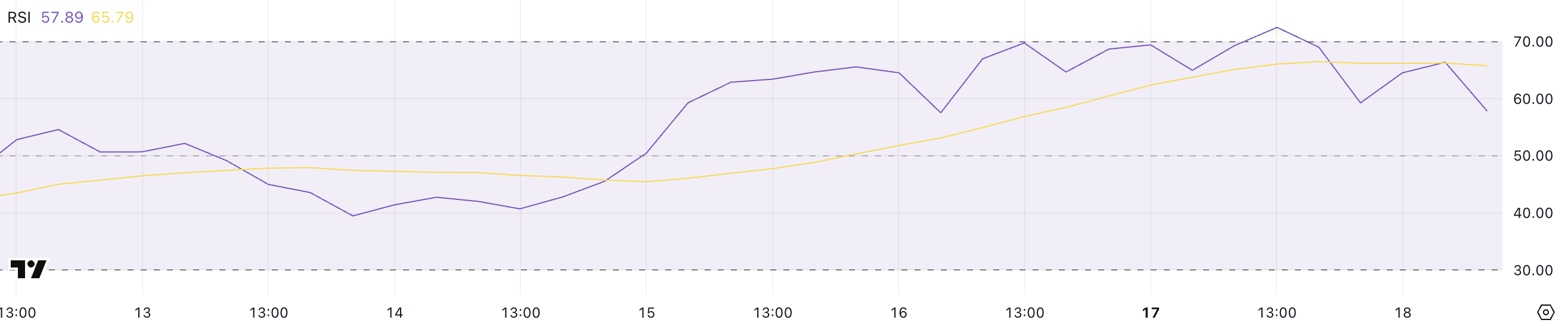 70以上の読みは一般的に買われ過ぎの状態を示し、資産が後退する可能性があることを示唆し、30以下の読みは売られ過ぎの状態を示し、買いの機会を示唆する可能性がある。
