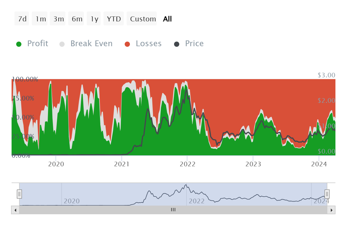 さらに、投資家の間でMATICを売却する可能性は、現時点ではかなり低い。その理由は、利益が出ないからだ。ヒストリカル・ブレイクイーブン指標によると、全投資家の53%近くが損失を出しており、利益を出している投資家は42%未満にとどまっている。