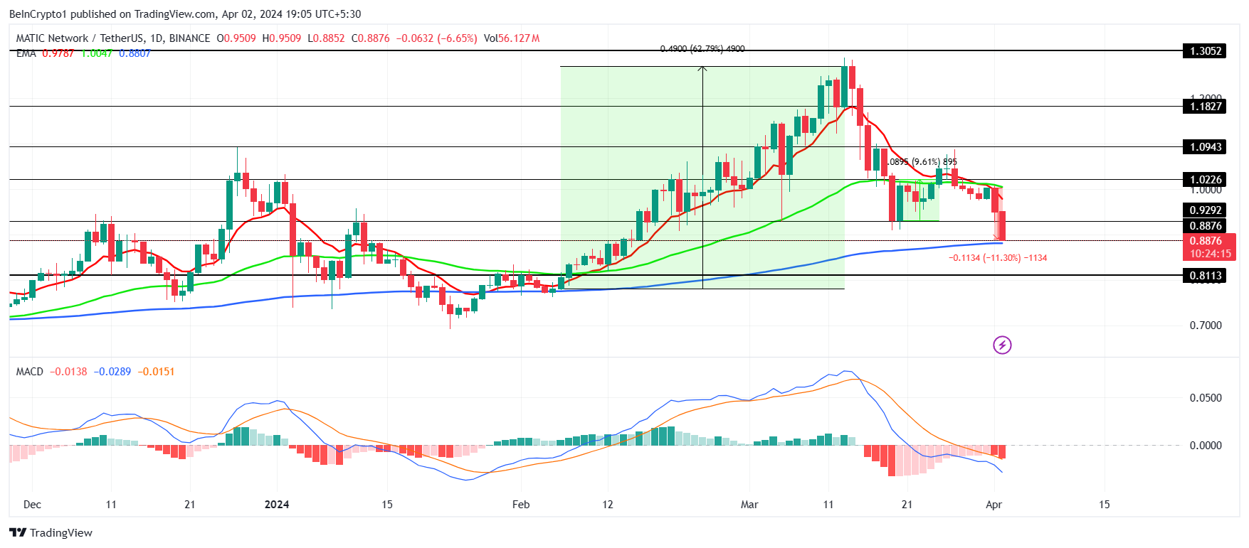 MATICの価格が0.900ドルを下回ったのは、2月中旬以来初めてのこと。暗号通貨は3月中旬に1.26ドルの高値をつけ、それ以来下落を続けている。その結果、アルトコインはその価値を失い、むしろ蓄積する良い選択肢のように思われるようになった。