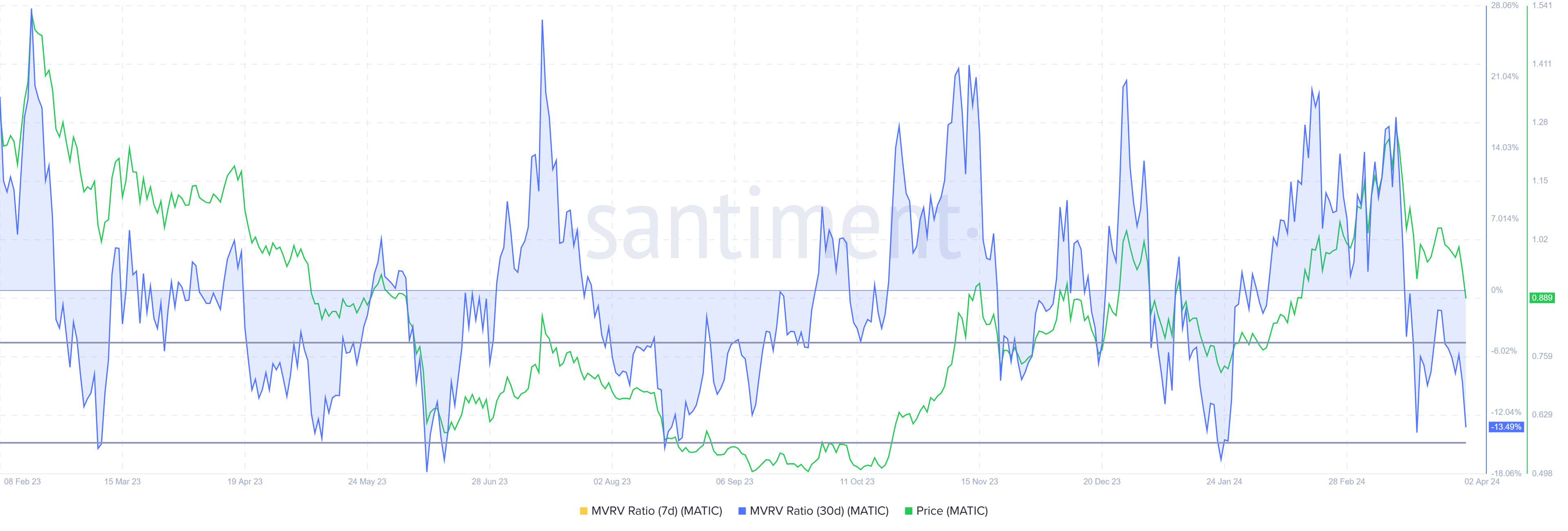 市場価値は、実現価値(MVRV)比率にもこれを示している。MVRV比率は投資家の利益/損失を追跡します。ポリゴン(MATIC)の30日MVRVは現在-14.75%で、損失を示しており、おそらく積み立てを促している。歴史的に、MVRVが-5%から-15%以内のMATICはしばしば上昇に先行し、このエリアをチャンスゾーンと呼んでいる。