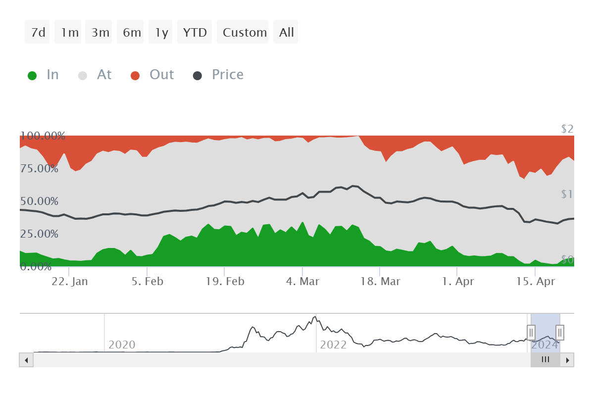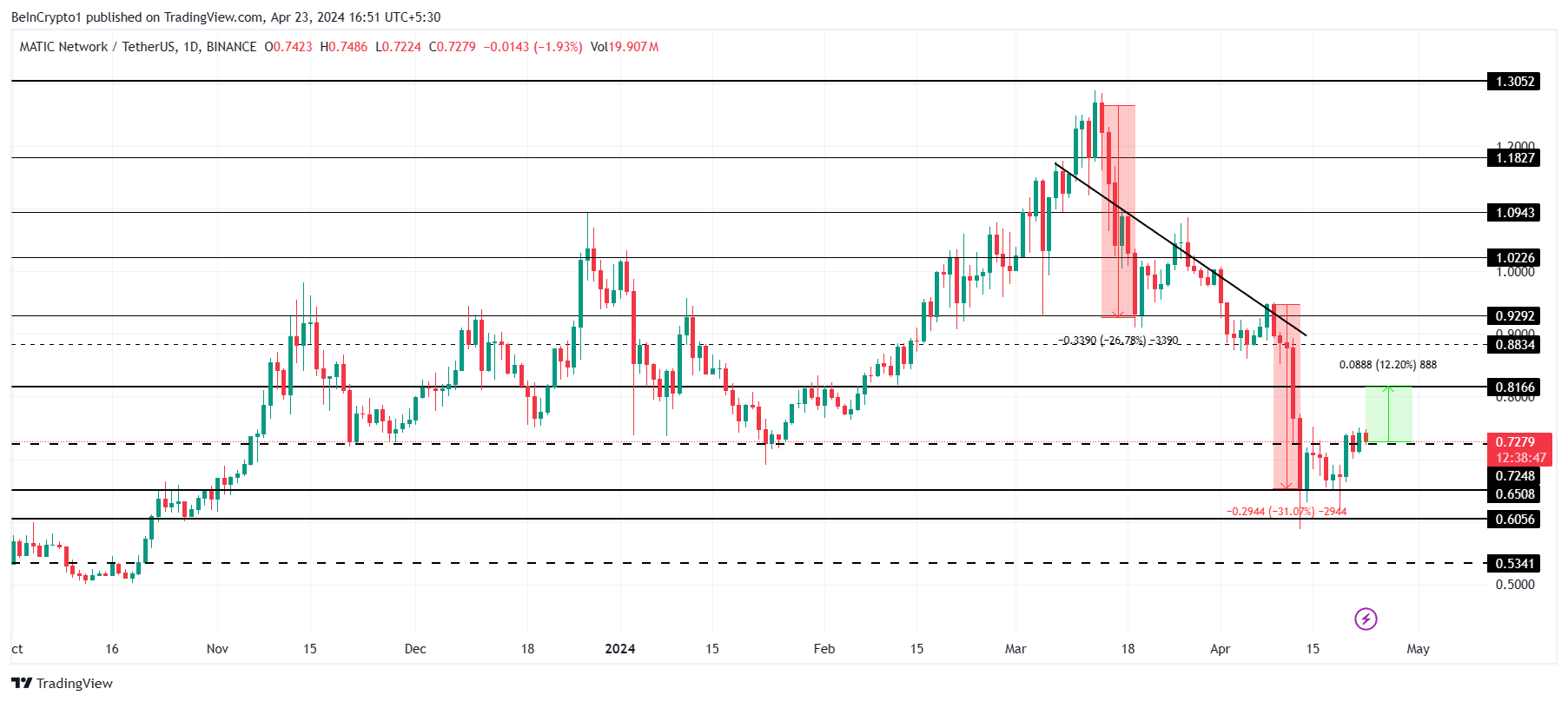 MATIC価格は日足チャートで上昇しており、ポリゴン(MATIC)の投資家はこの回復の可能性に注目している。投資家らはそれに従って行動しており、ネットワークはここ数日、最小限の売りにとどまっている。