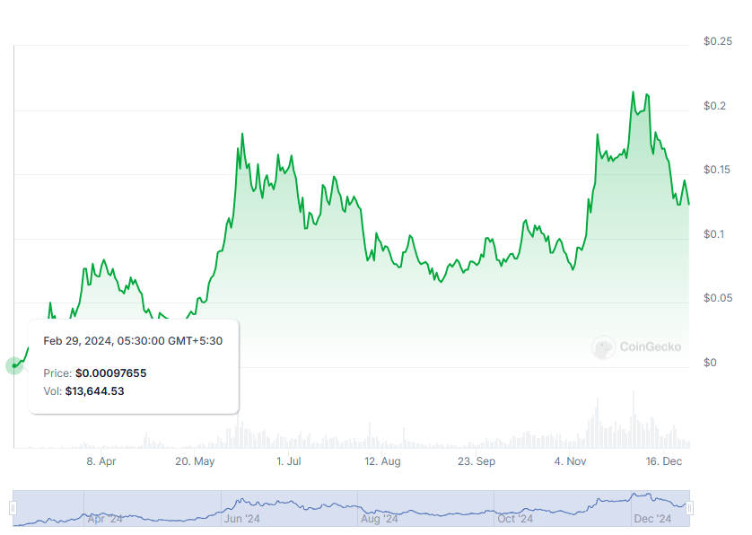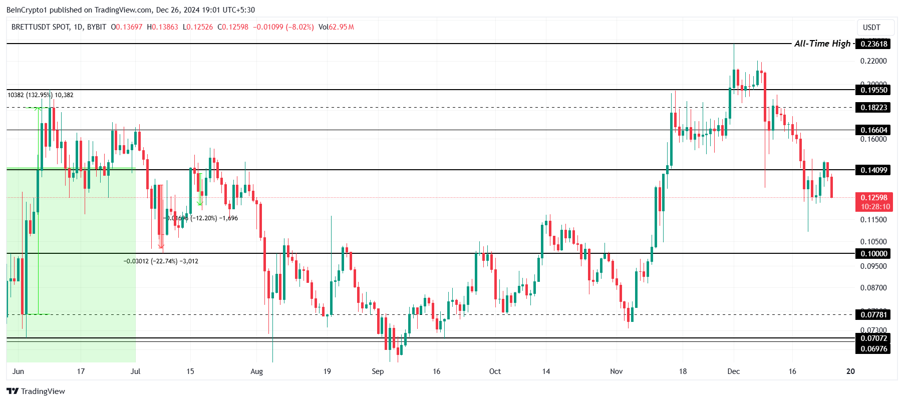 Sponsored Sponsored現在0.125ドルで取引されているBRETTは、今月確立されたATHの0.236ドルを大きく下回っています。このミームコインは、より広範な市場の上昇傾向の合図に依存して、再び上昇することを目指しています。
