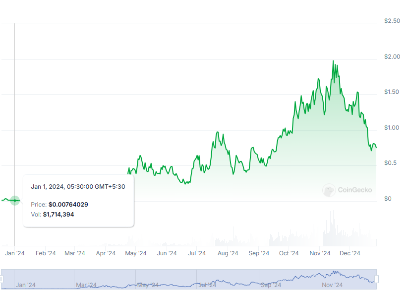 POPCATは11月中旬に2.10ドルまで上昇し、新たなATHを記録しました。しかし、それ以来、ミームコインはあまりうまくいっておらず、現在0.74ドルで取引されており、64%下落しています。