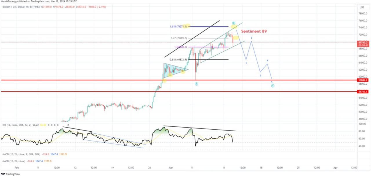 実際、デジタル資産分析会社スイスブロック13日に共有した資料で、ビットコイン価格が5万8000ドルまで下落する可能性を指摘した。同社は現在の価格が頂点ではないとしながらも「暗号資産市場は一直線に上昇することはない。ビットコイン(BTC)も例外ではない」と主張。「1月下旬には38,000ドルだったビットコインが、3月初旬には72,000ドルに急騰した。しかし、どの上昇も反動なしには発生しない。現在、反動の兆しが見え始めている」と付け加えた。