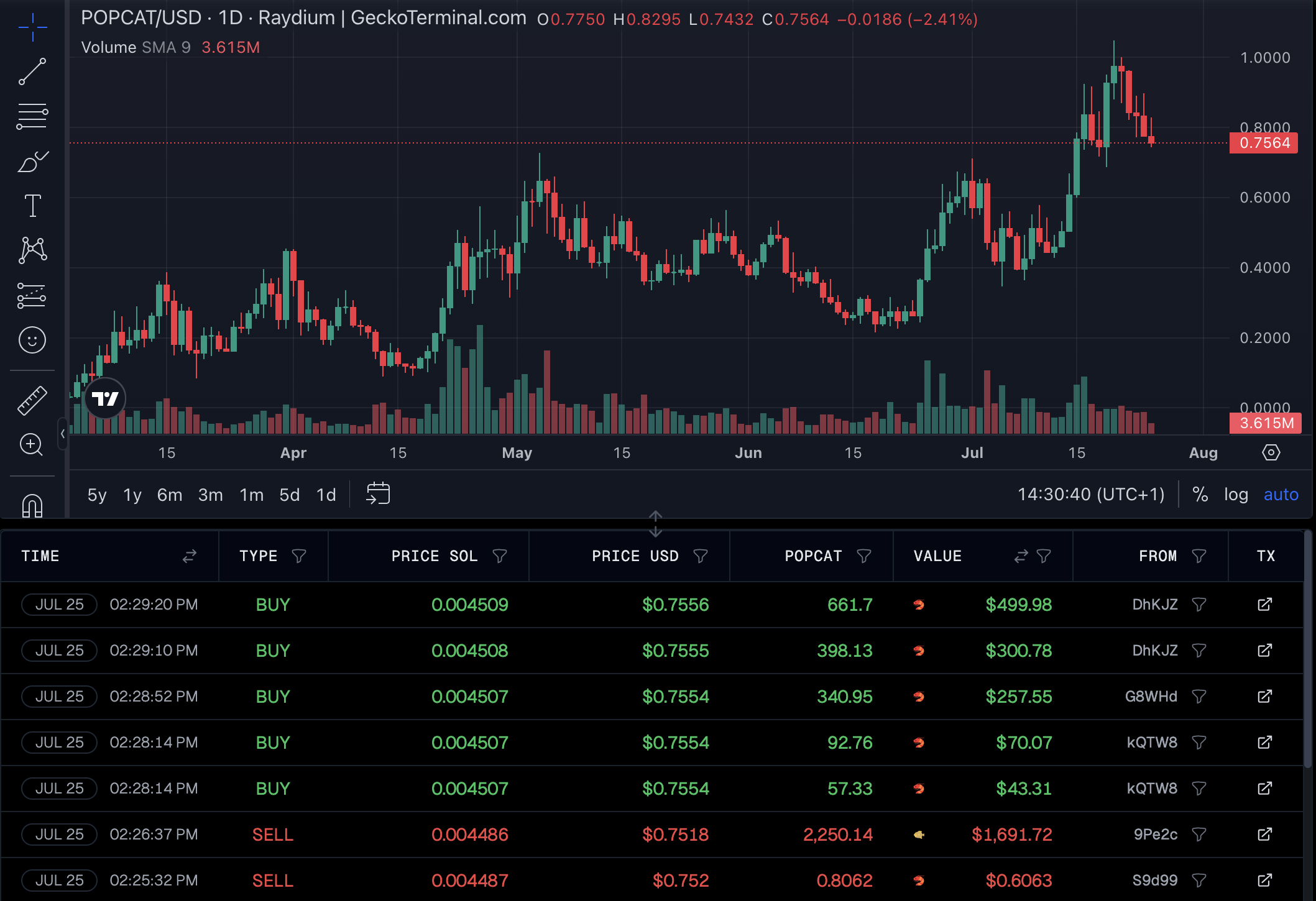 この記事を書いている時点で、POPCATはソラナミームのトップコインの1つとなっており、0.75ドルで取引されている。先に述べたように、これは7月21日の高値からの下落です。しかし、DEXトラッカーのGeckoTerminalによると、市場参加者はこの下落を利用し、ミームコインを買い増している。