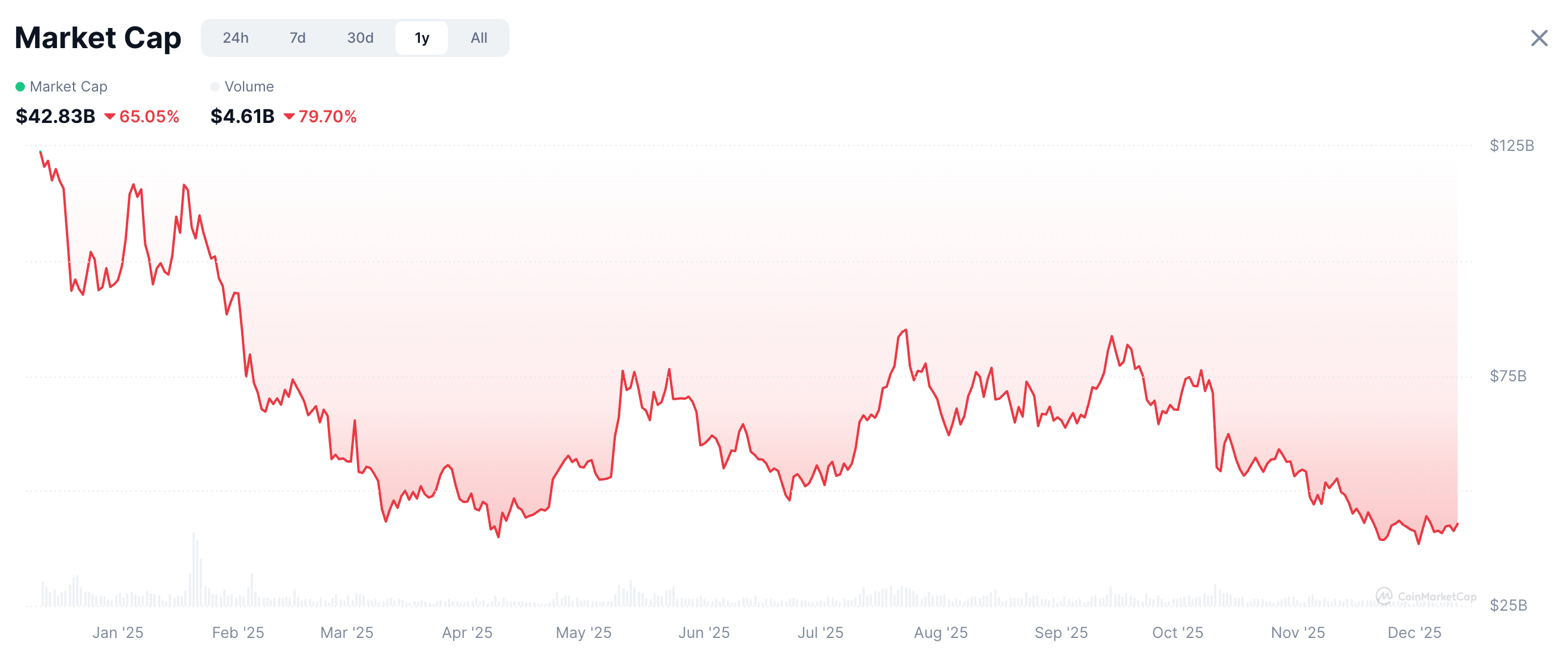 11月にはミームコイン全体の時価総額が年初の約1,167億ドルから約394億ドルまで縮小し、2025年安値圏に沈んだとするリポートもある。下落率はおよそ66%に達し、「ミームコイン冬」の象徴的な局面となった。