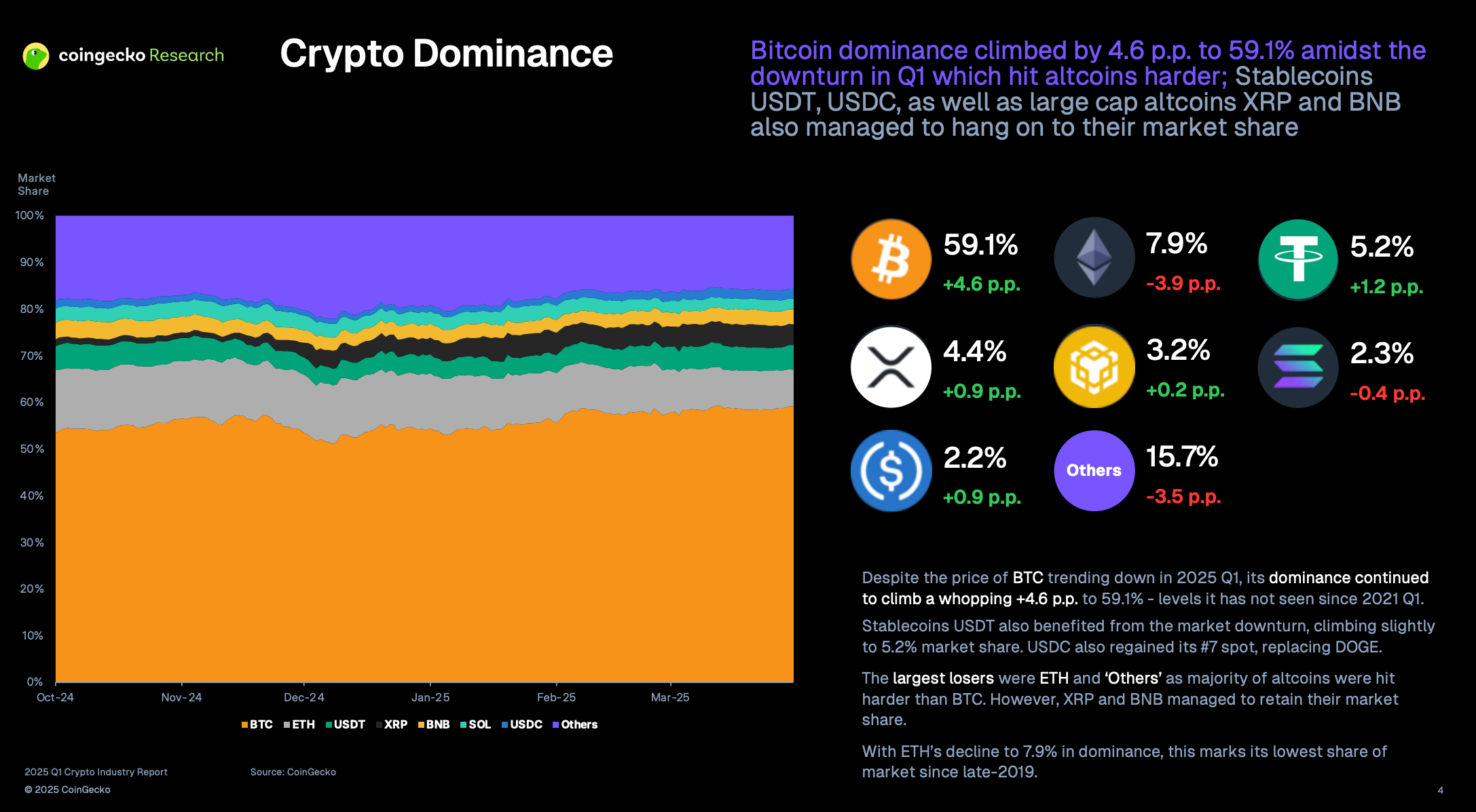 CoinGecko の「Crypto Industry Report Q1 2025」によれば、2025 年第1四半期のスポット取引量に占めるミームコインの割合は 約 3〜4% と、主要カテゴリの中で最も小さい構成比にとどまった。ビットコイン(約46%)、ステーブルコイン(約22%)と比べると存在感は限定的で、市場の流動性がミームコインから離れている実態が示されている。