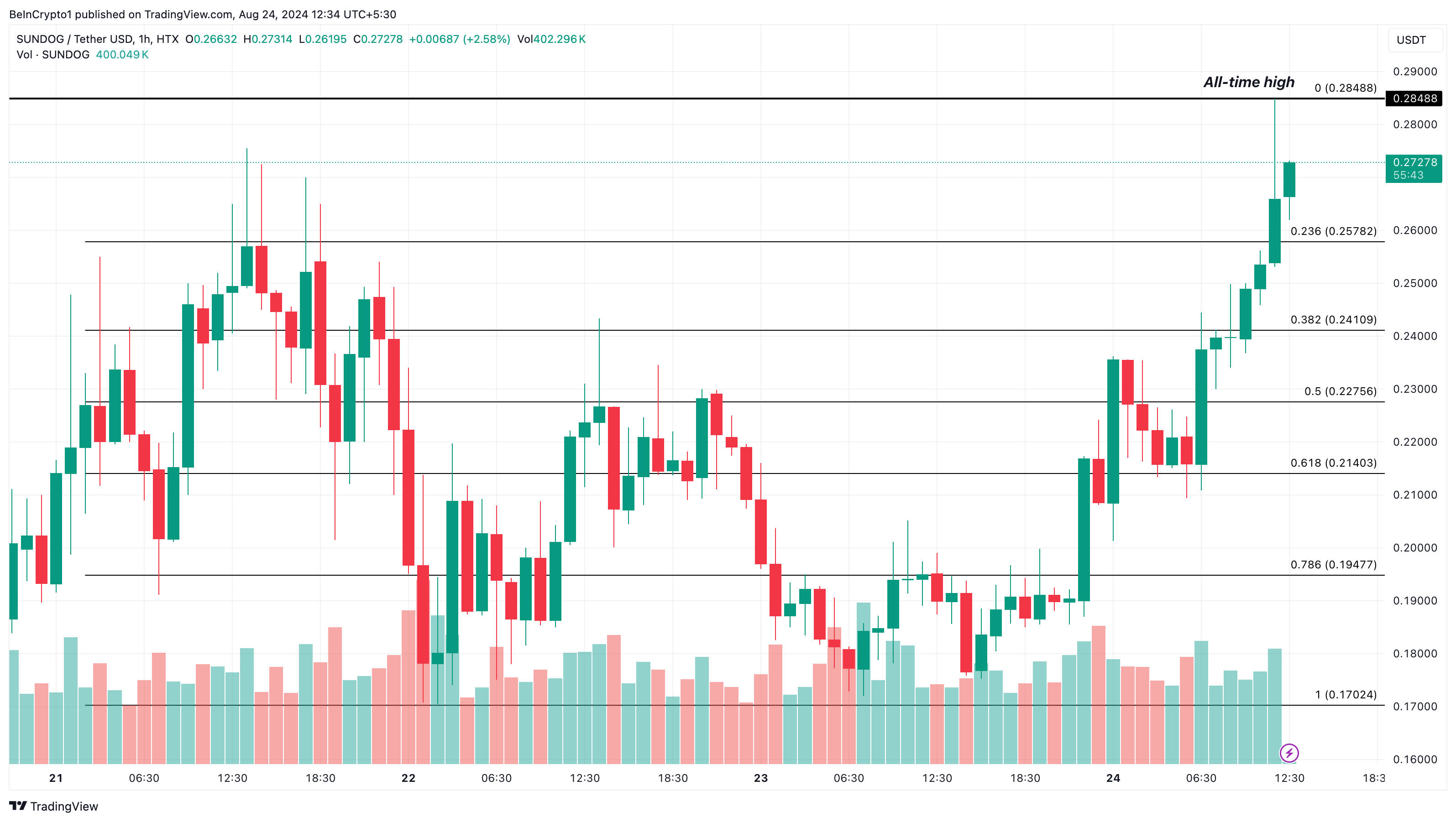 過去7日間で、SUNDOGの価格は約400%上昇し、最近0.28ドルの新高値をつけた。時間足では、価格は0.26ドルとわずかに減少している。さらに、フィボナッチリトレースメントは、0.25ドルの23.6%レベルまでの引き戻しの可能性を示している。