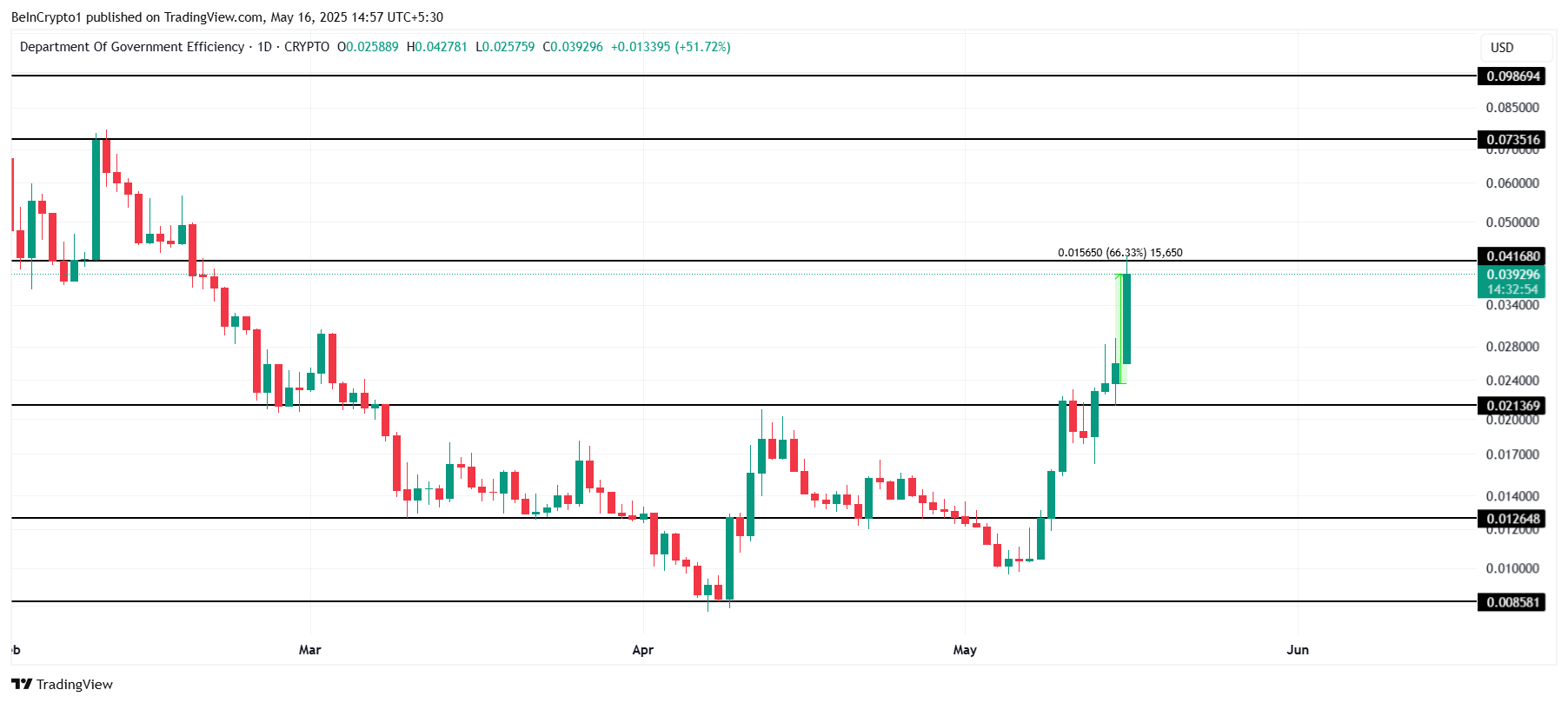 DOGEの価格は1日で66%上昇し、0.0392ドルに達し、最も好調なミームコインとなった。このラリーは3月に経験した損失を回復し、DOGEへの投資家の関心と市場の勢いを示している。
