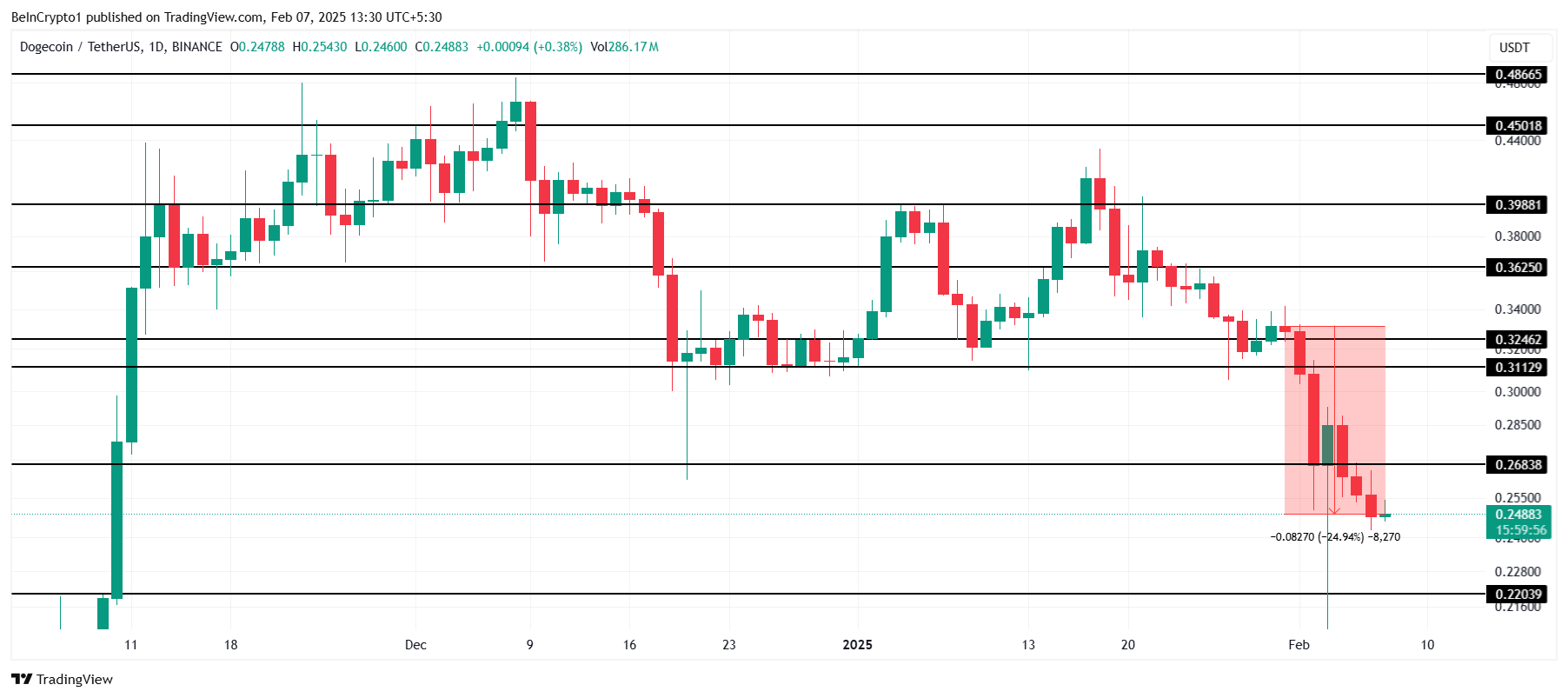 ドージコインの次の重要なサポートは0.220ドルであり、短期的な軌道を決定する可能性がある。このサポートに達した場合、投資家は損失を最小限に抑えるために保有を売却し始めるかもしれない。