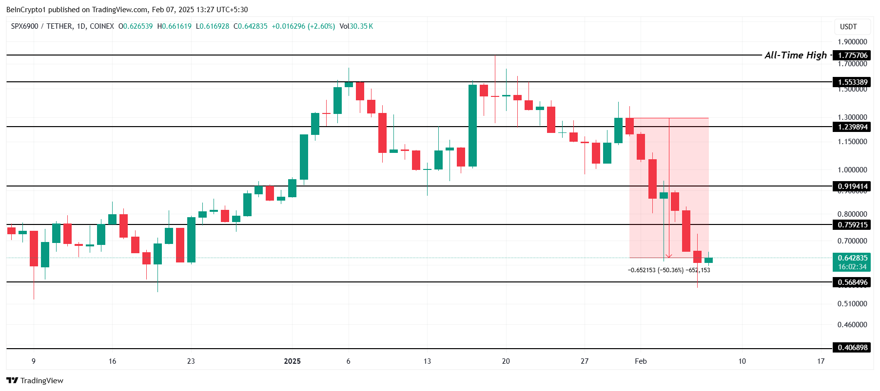 SPXは大幅な修正を受け、過去1週間で50%下落し、本稿執筆時点で0.642ドルで取引されている。この急落により、ミームコインは激しい売り圧力にさらされ、投資家の間で懸念が高まっている。下落にもかかわらず、SPXは依然として重要なサポートレベルを上回っている。